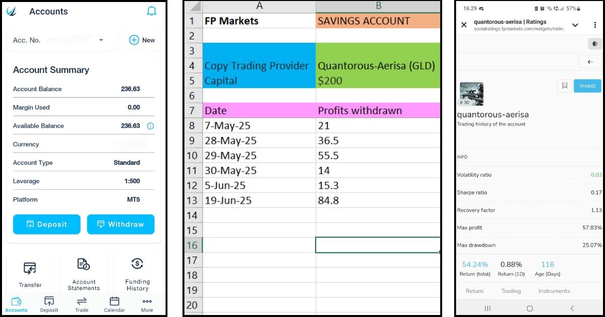 So on 30 April, I put in $200 to follow this trader. After about a month or so, I withdrew $227.10—that’s a 113.55% return. Wild, right?